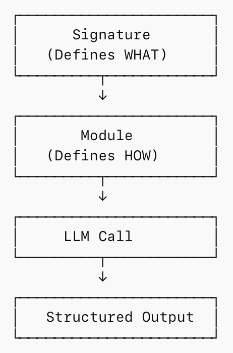- Signature-First Design: You define your data contracts before implementation. Instead of starting with prompts, you start with structure. Clearly specifying inputs and expected outputs. This makes the system more predictable and easier to scale. Because of this, the LLM isn’t guessing what to produce, it’s guided by a defined schema. Field names, types, and descriptions act as implicit instructions, improving consistency and output quality.